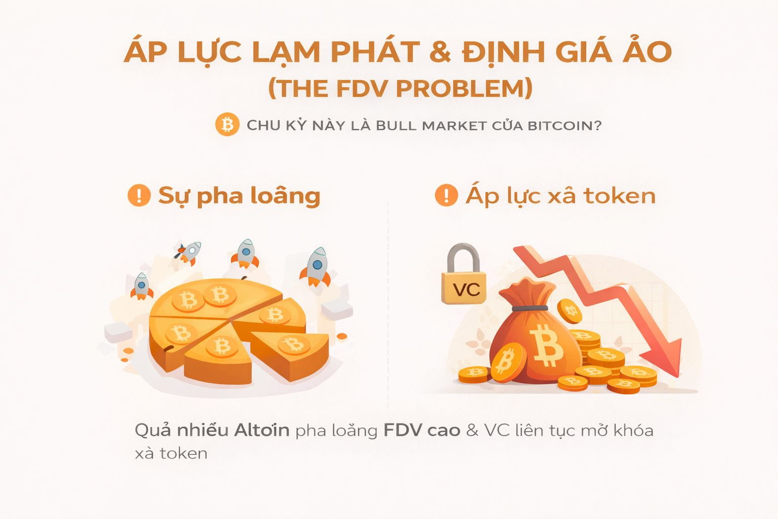 Áp lực xả token: Rất nhiều Altcoin hiện nay lên sàn với mức định giá pha loãng (FDV) cực cao nhưng lượng cung lưu thông lại rất thấp. Việc các quỹ đầu tư mạo hiểm (VC) liên tục mở khóa và xả token hàng tháng đã tạo ra một lực bán áp đảo, khiến giá Altcoin không thể tăng trưởng bền vững dù Bitcoin có lập đỉnh mới.