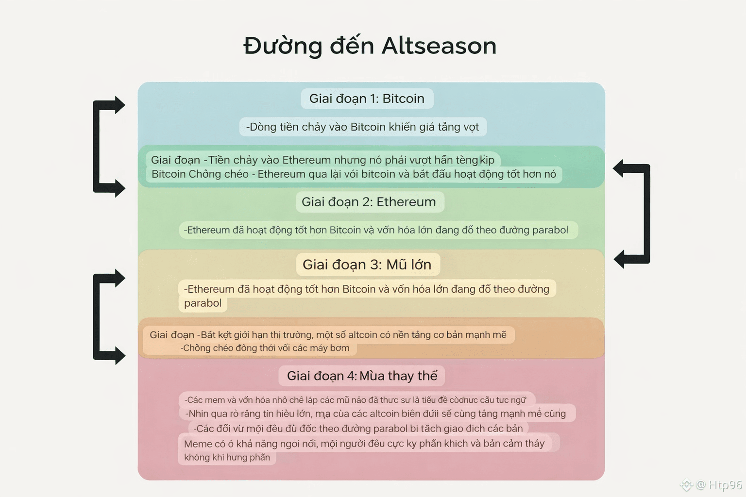 Trong quá khứ, quy luật thường là: BTC tăng -> ETH tăng -> Altcoin lớn -> Altcoin nhỏ.
