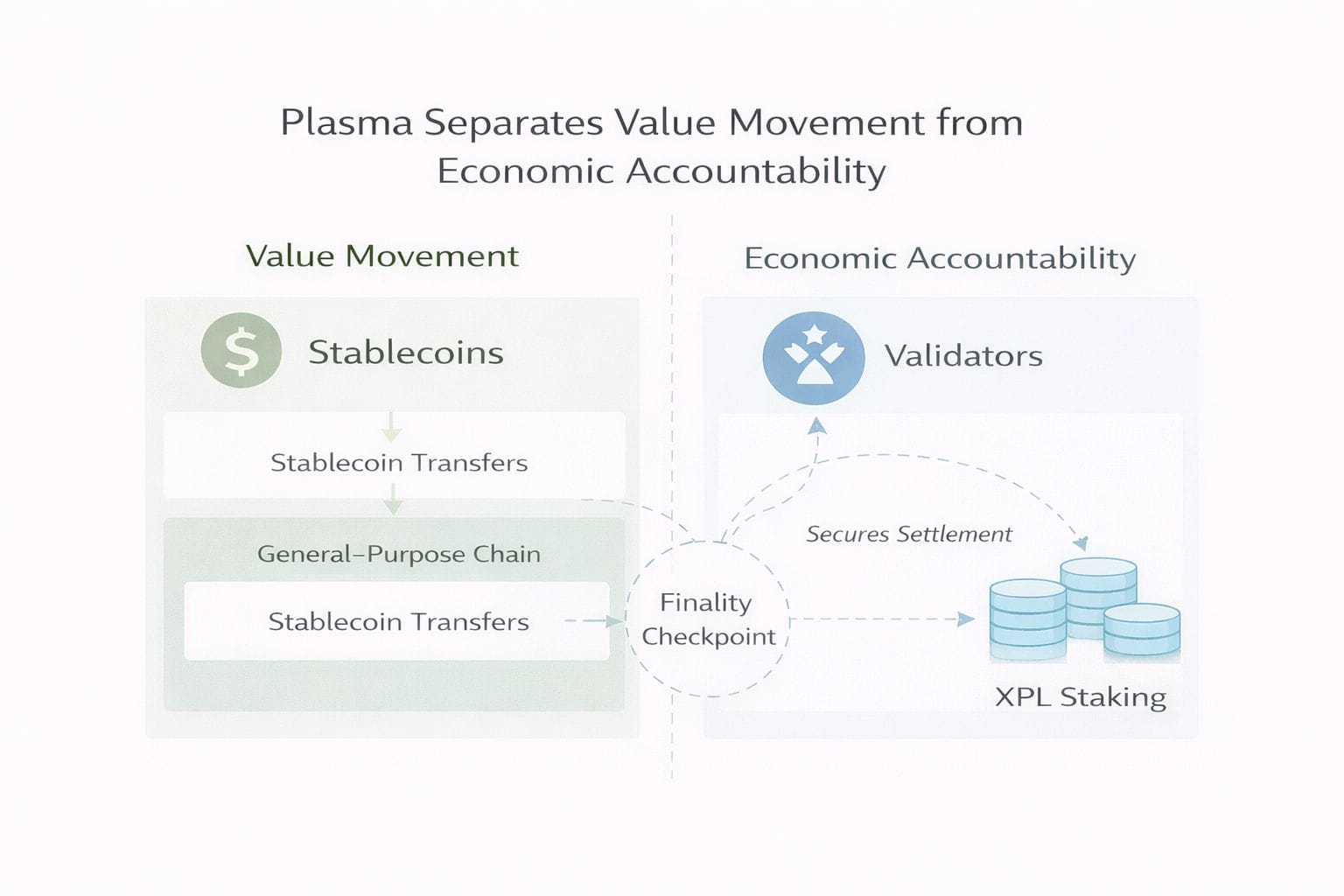 Lựa chọn thiết kế quan trọng nhất mà Plasma thực hiện là tách biệt di chuyển giá trị khỏi trách nhiệm kinh tế. Stablecoin được phép di chuyển một cách tự do và dự đoán, trong khi rủi ro thanh toán được tập trung ở nơi khác. Các validator đặt cược XPL, và khoản đặt cược đó là thứ hấp thụ hậu quả của việc hoàn tất không chính xác. Người dùng không được yêu cầu phải bảo lãnh rủi ro giao thức với số dư thanh toán của họ.