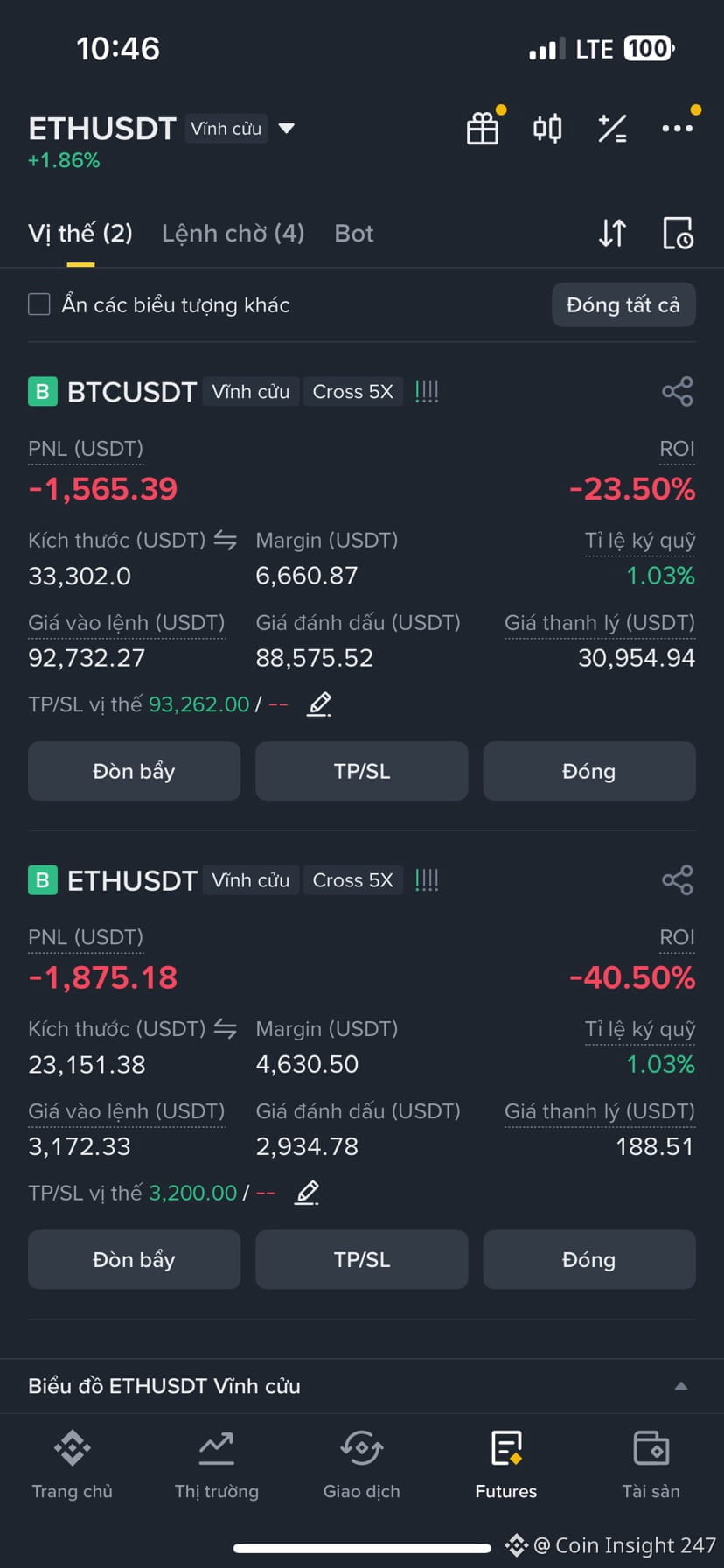Anh ấy vào lệnh long scalp BTC và ETH với mục tiêu khá rõ ràng. Với BTC, chỉ cần lời khoảng 1000 giá là chốt. Với ETH, lời khoảng 40 giá thì thoát lệnh. Kế hoạch ban đầu nghe có vẻ ổn, nhưng vấn đề nằm ở chỗ anh ấy không hề cài điểm cắt lỗ.