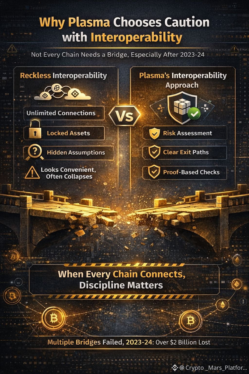 I remember how excited we were in 2021 when everything started connecting to everything. I watched liquidity jump chains in seconds. I also watched confusion rise just as fast. I’ve learned that interoperability sounds like freedom, but without discipline, it turns into fragility. That mindset shapes how I read Plasma’s approach to interoperability with other chains.