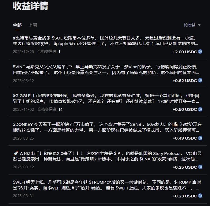 Điều này đòi hỏi bạn cần phải có độ nóng trong một lĩnh vực nào đó, chẳng hạn như bạn thích giao dịch, hoặc bạn thích chơi meme, chỉ cần bạn đủ đam mê, bạn có thể hưởng lợi từ việc hoàn tiền, bạn có cái nhìn rõ ràng và độc đáo về giao dịch của mình, không nhất thiết phải là bậc thầy kiếm tiền, mọi người thực sự thích thấy sự thật, nhà đầu tư nhỏ có lãi có lỗ mới là sự thật, bạn có thể trình bày quan điểm giao dịch độc đáo của mình ở quảng trường hoặc phòng livestream, từ đó thu hút người dùng thích bạn nhấp vào liên kết đăng ký của bạn. Con đường này chậm, giai đoạn đầu có thể không thấy tiền. Nhưng chỉ cần bạn kiên trì làm, đây sẽ là một nguồn thu nhập liên tục. Đây cũng là lý do mà nhiều nhân vật lớn phải kiên trì trong quảng trường.
