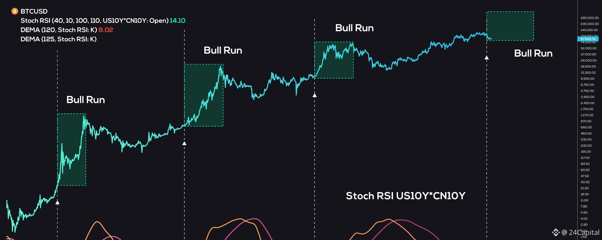 (CN10Y) đã tạo bullish cross khi so sánh với biểu đồ Bitcoin khung