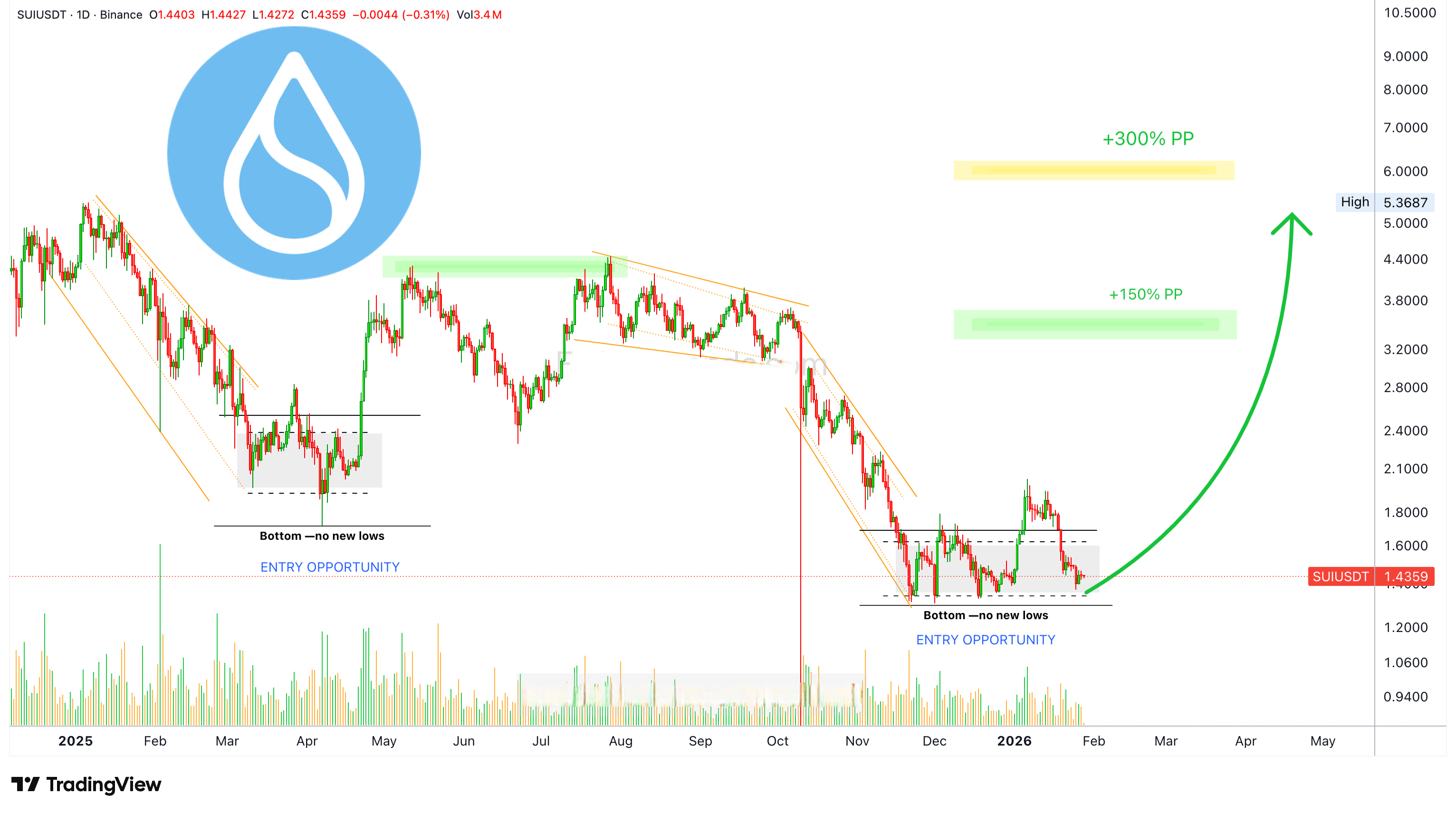 Biểu đồ này có tiềm năng tăng giá rất mạnh vì hành động đang diễn ra tại mức hỗ trợ và xu hướng giảm không còn nữa. Không có mức thấp mới trong khi Sui đang cố gắng thoát khỏi một đáy lớn.