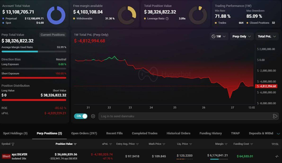 Thị trường vừa đánh dấu một vị thế bán khống bạc lớn trị giá khoảng $38.3 triệu, được mở với đòn bẩy cực lớn (20–25x) là một cược có độ tin cậy cao được đặt trong một vùng giá rất nhạy cảm.
