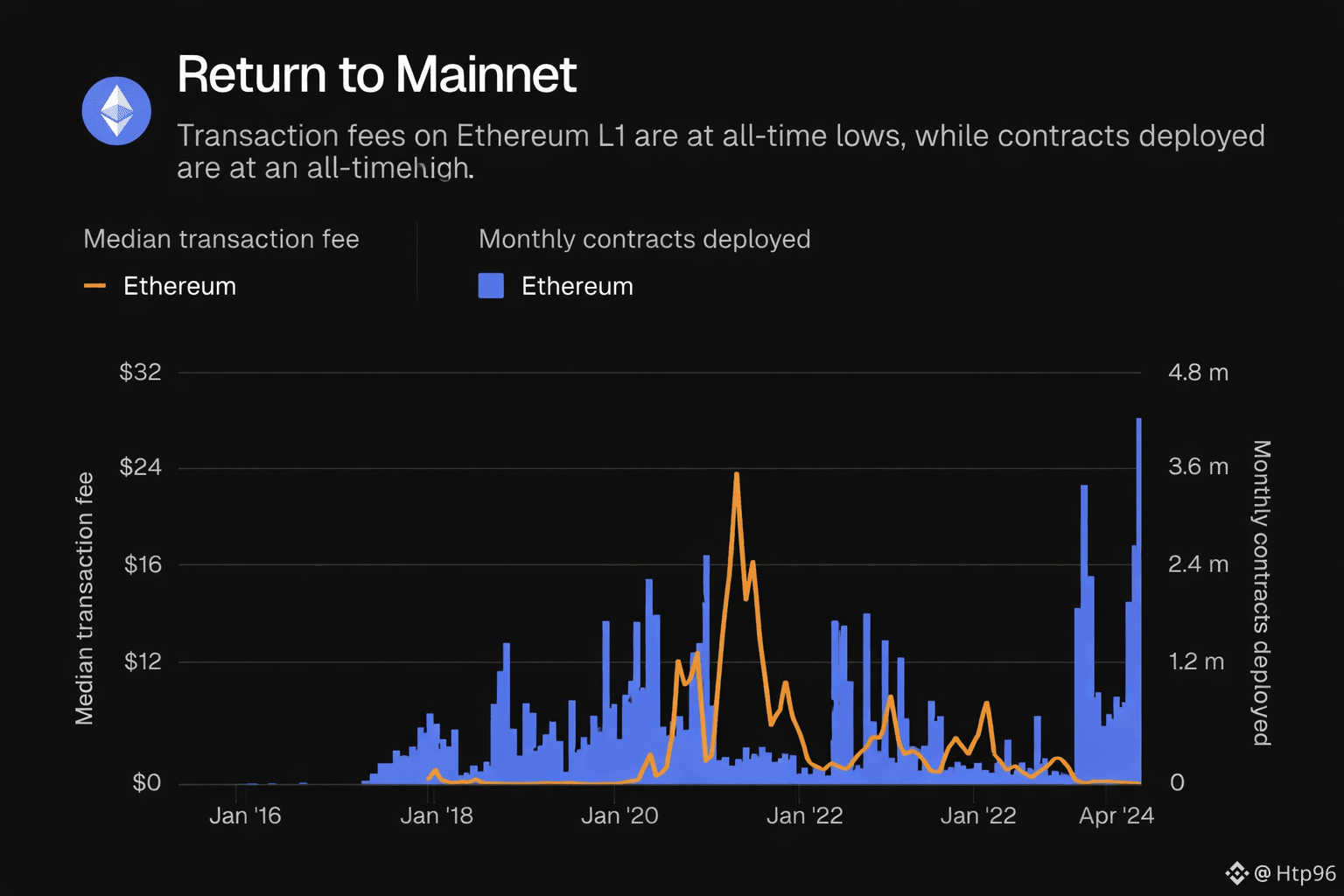 Phí giao dịch trên Ethereum L1 hiện đang ở mức rất thấp so với mặt bằng lịch sử, tạo ra một môi trường thuận lợi hiếm có cho hoạt động triển khai và thử nghiệm. Đáng chú ý, xu hướng này không phản ánh sự suy giảm nhu cầu, mà trái lại: số lượng hợp đồng thông minh được triển khai trên Mainnet đang đạt mức cao nhất từ trước đến nay.