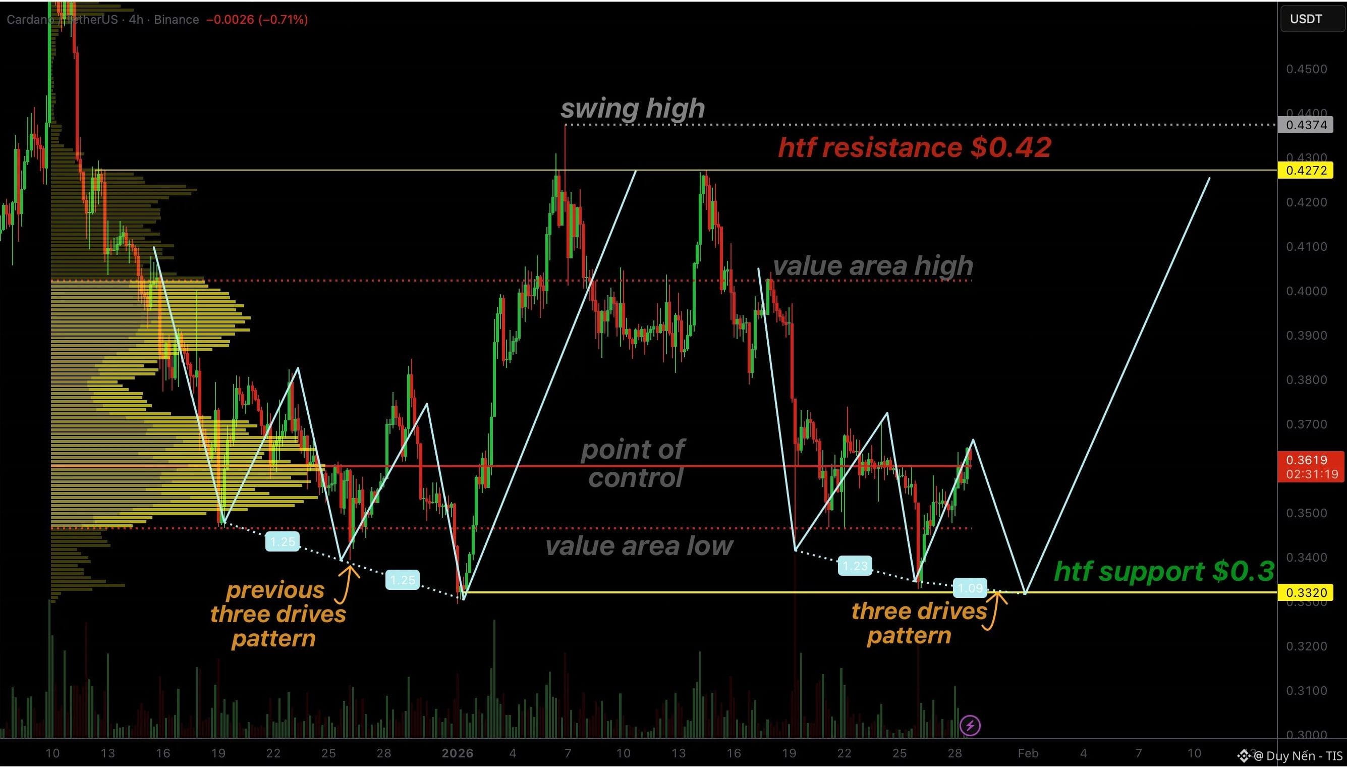 Giá hiện đang tích lũy quanh vùng Point of control. Nếu giá bị từ chối nhẹ ở đây và test lại $0.33 thêm một nhịp nữa thì vẫn đúng bài, miễn là có lực mua đẩy lên sau đó. Kèo này chỉ sống khi mốc $0.33 được giữ vững. Nếu thủng mốc này thì vứt chart, xác định mô hình thất bại và giá sẽ tìm đáy sâu hơn.
