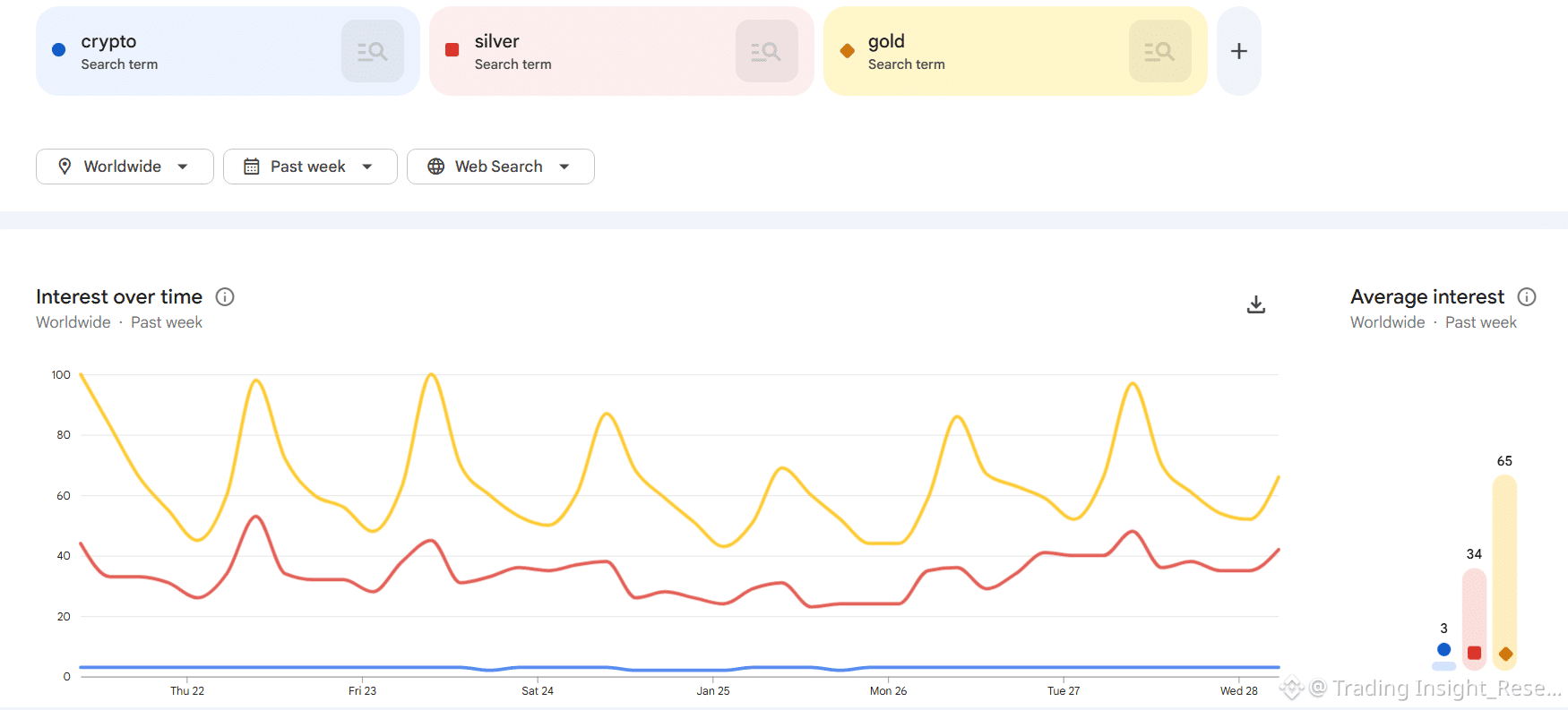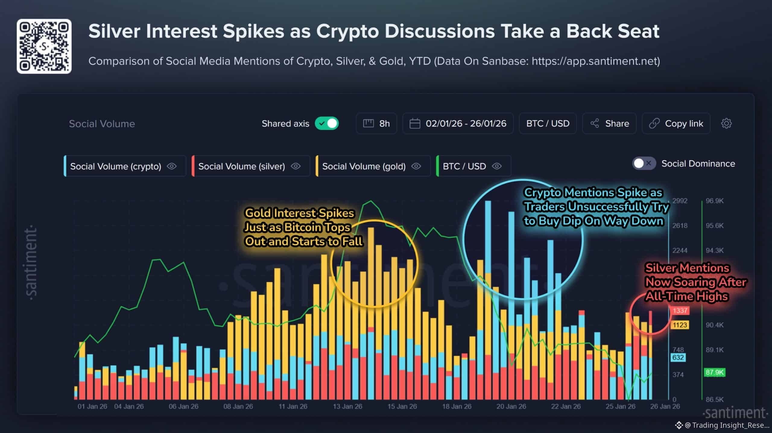 Dữ liệu từ Google Trends và Santiment xác nhận rằng sự chú ý và FOMO của nhỏ lẻ đã chuyển từ crypto sang Vàng/Bạc để đu theo những tài sản tăng trưởng nhanh nhất.