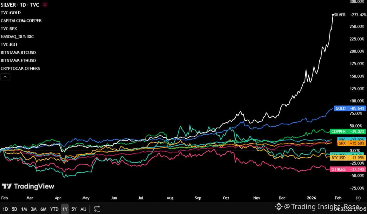 Trong 12 tháng qua, Bạc tăng +267%, Vàng tăng +84%, và Đồng tăng +38%.