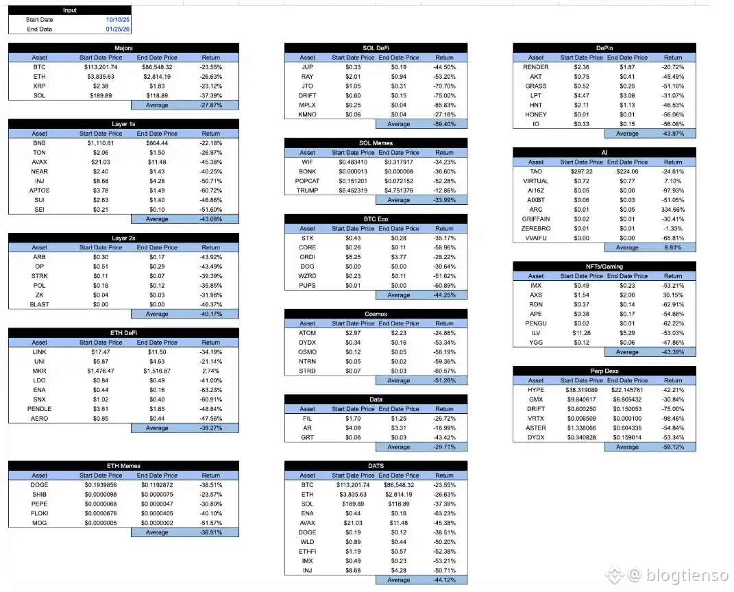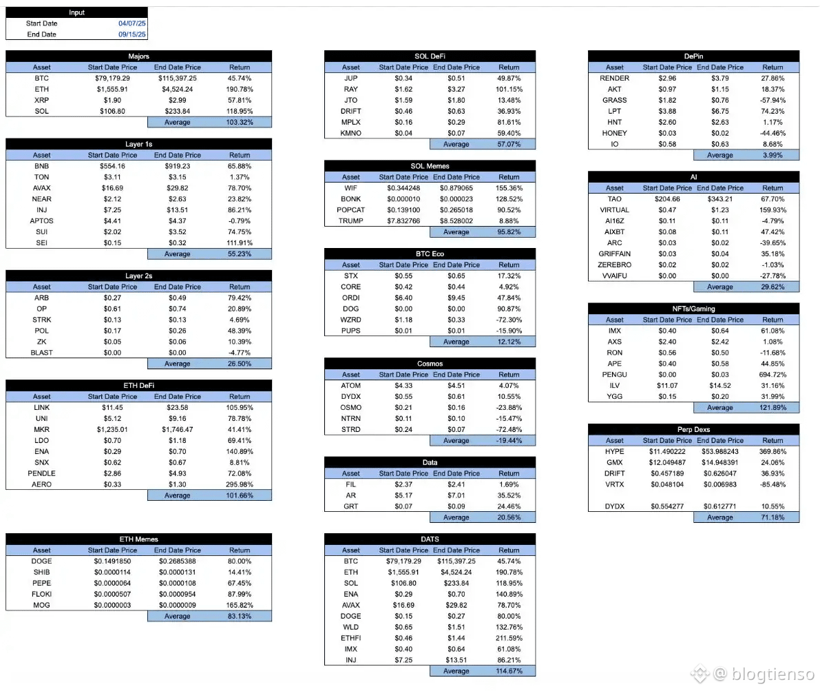 Bảng này có vẻ hơi khả quan trong thời kỳ thị trường thịnh vượng. Các token "tốt" thường hoạt động tốt hơn các token "xấu". Nhưng một hệ thống lành mạnh thực sự nên ngược lại: bạn muốn các token tốt hoạt động tốt hơn trong thời kỳ khó khăn, chứ không chỉ trong thời kỳ thuận lợi. Dưới đây là bảng tương tự từ mức thấp nhất vào ngày 7 tháng 4 đến mức cao nhất vào ngày 15 tháng 9.