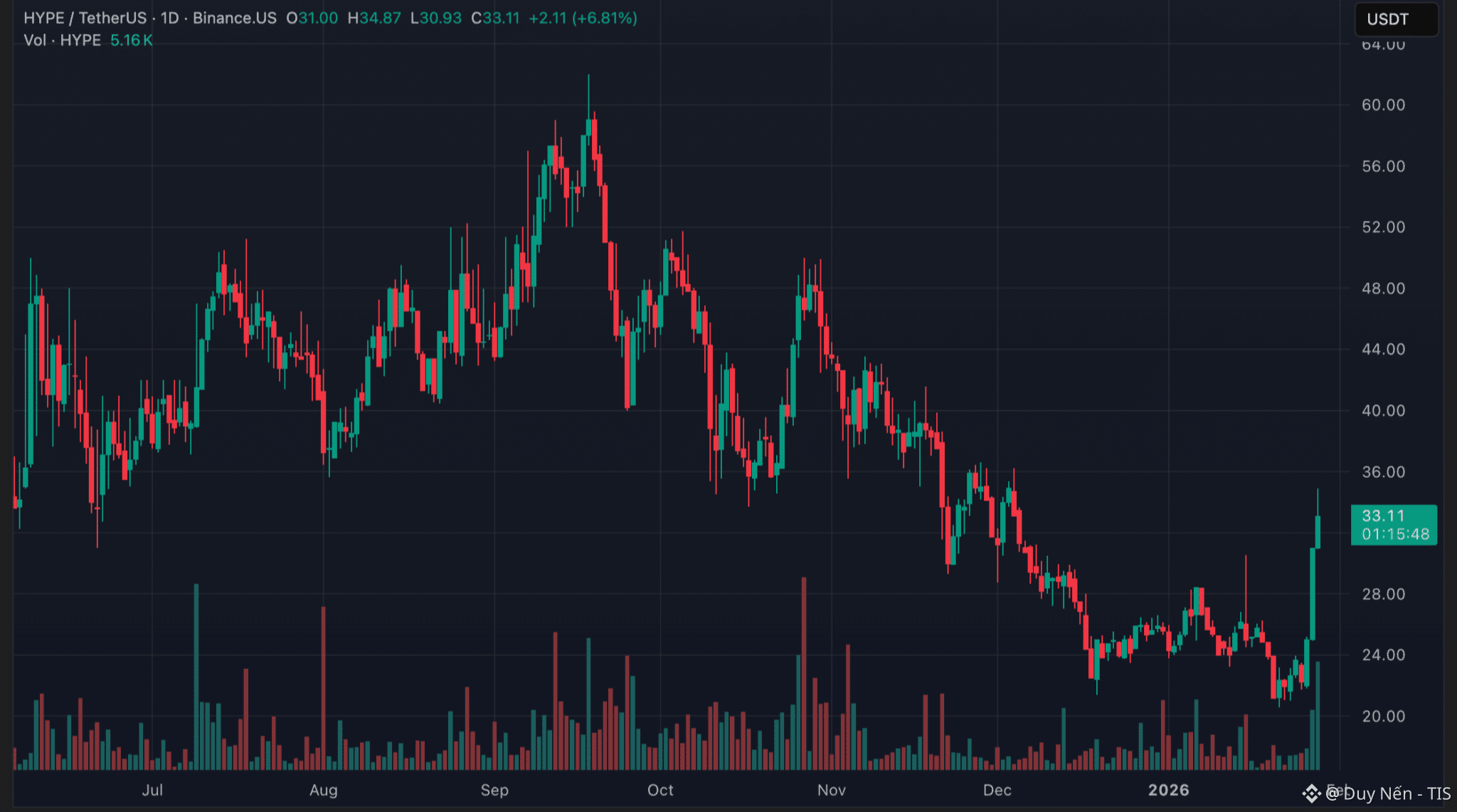 Bất chấp bối cảnh vĩ mô ảm đạm, HYPE đã có pha bứt phá ngoạn mục. Trên khung ngày, HYPE tăng gần 7%, chạm mốc $33 với vol mua cực lớn, xác nhận đây là dòng tiền mới vào chứ không phải bơm thổi thanh khoản thấp. Tính theo tuần, token này đã tăng hơn 50%, bỏ xa các đàn anh như BTC, ETH, SOL hay XRP.