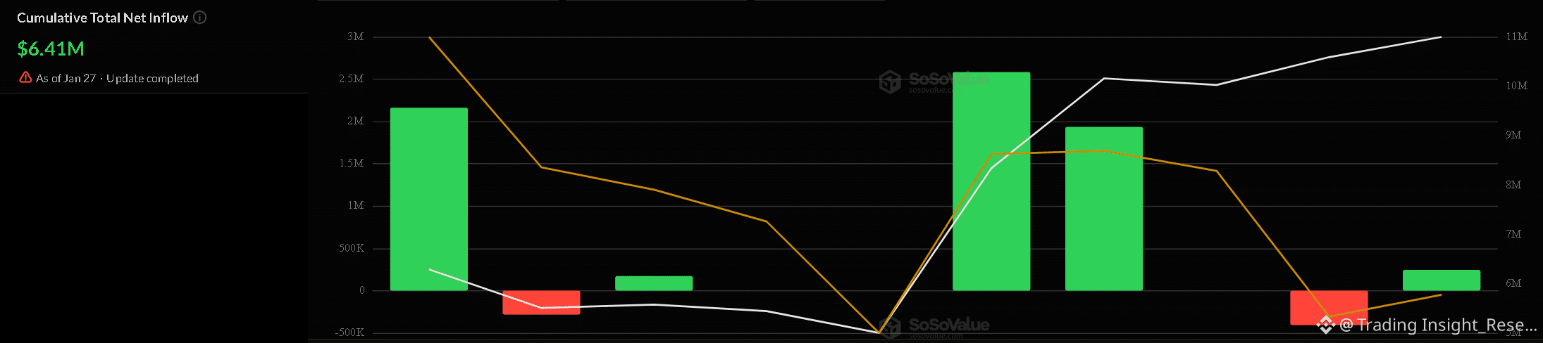 Sự quan tâm của tổ chức còn khiêm tốn nhưng đang tăng. Dòng tiền tháng 1 (4.07 Triệu USD) đã vượt tổng cộng của tháng 11 & 12/2025, dù tổng dòng tiền tích lũy chỉ mới đạt 6.41 Triệu USD.