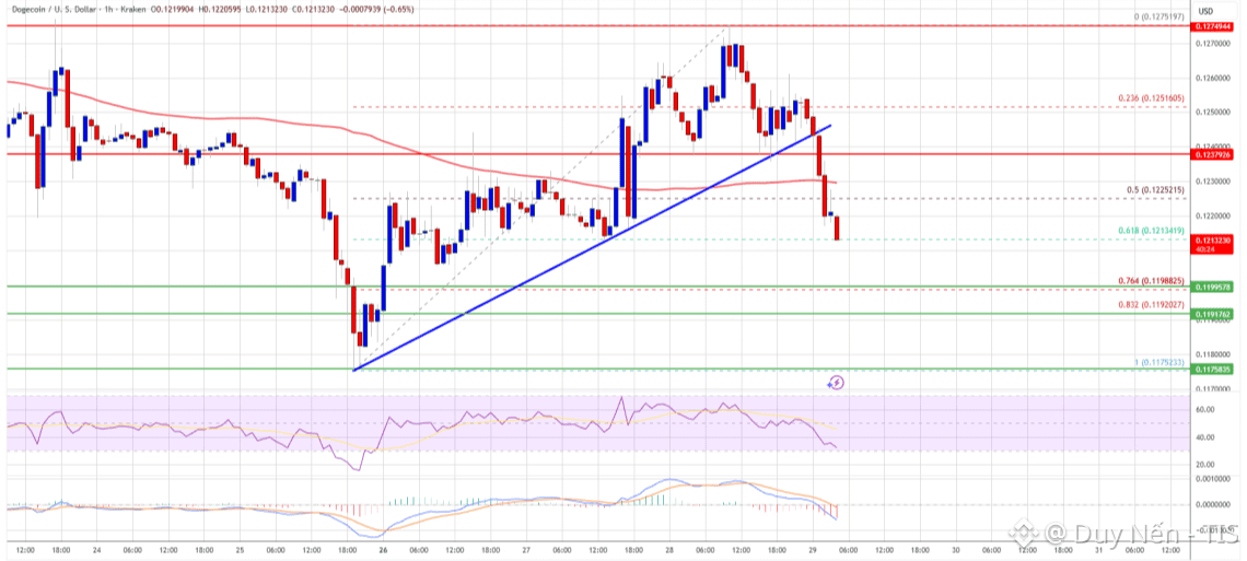 Anh em chơi $DOGE chú ý! Sau khi tạch mốc $0.1275, DOGE đã có pha quay đầu điều chỉnh và hiện đang giao dịch dưới mức $0.1220 so với Đô la.
