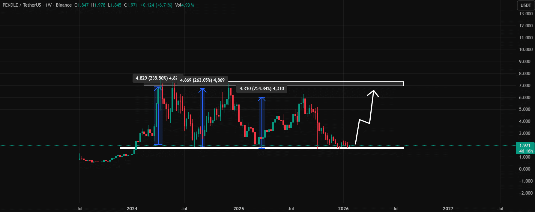 PENDLE đang giao dịch tại biên dưới của kênh song song tuần ($1.70). Trong lịch sử (tháng 3/24, 8/24, 3/25), mỗi lần chạm vùng này đều dẫn đến mức tăng trên 200%.