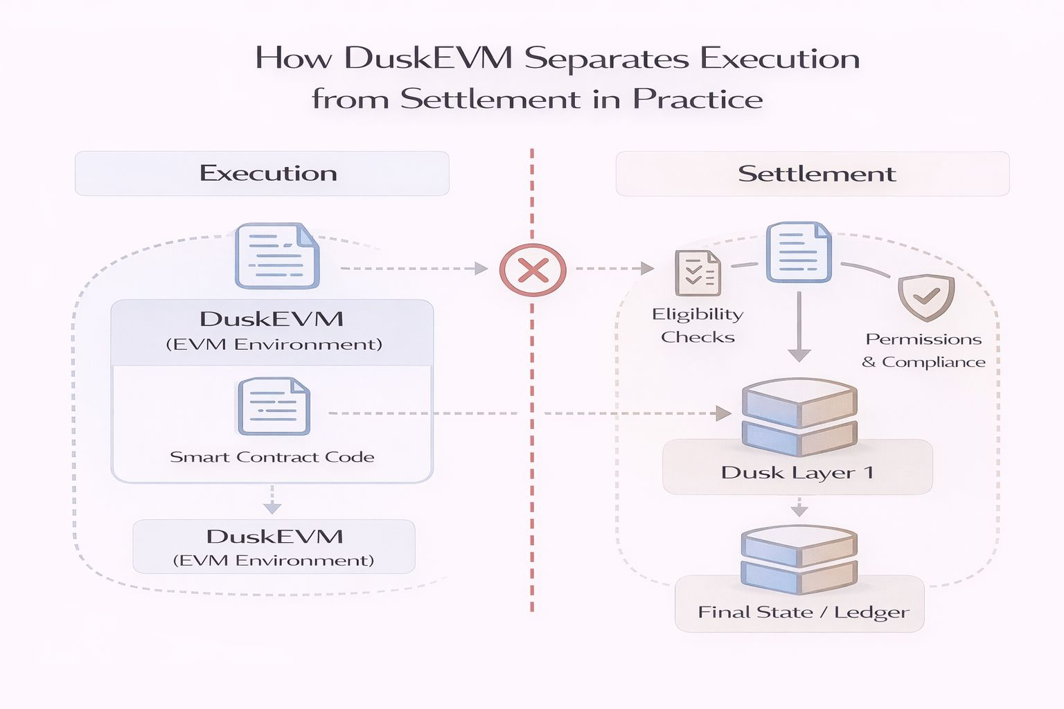 DuskEVM tránh sự tích lũy đó bằng cách từ chối coi việc thực thi như sự đồng ý.
