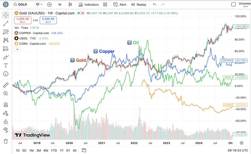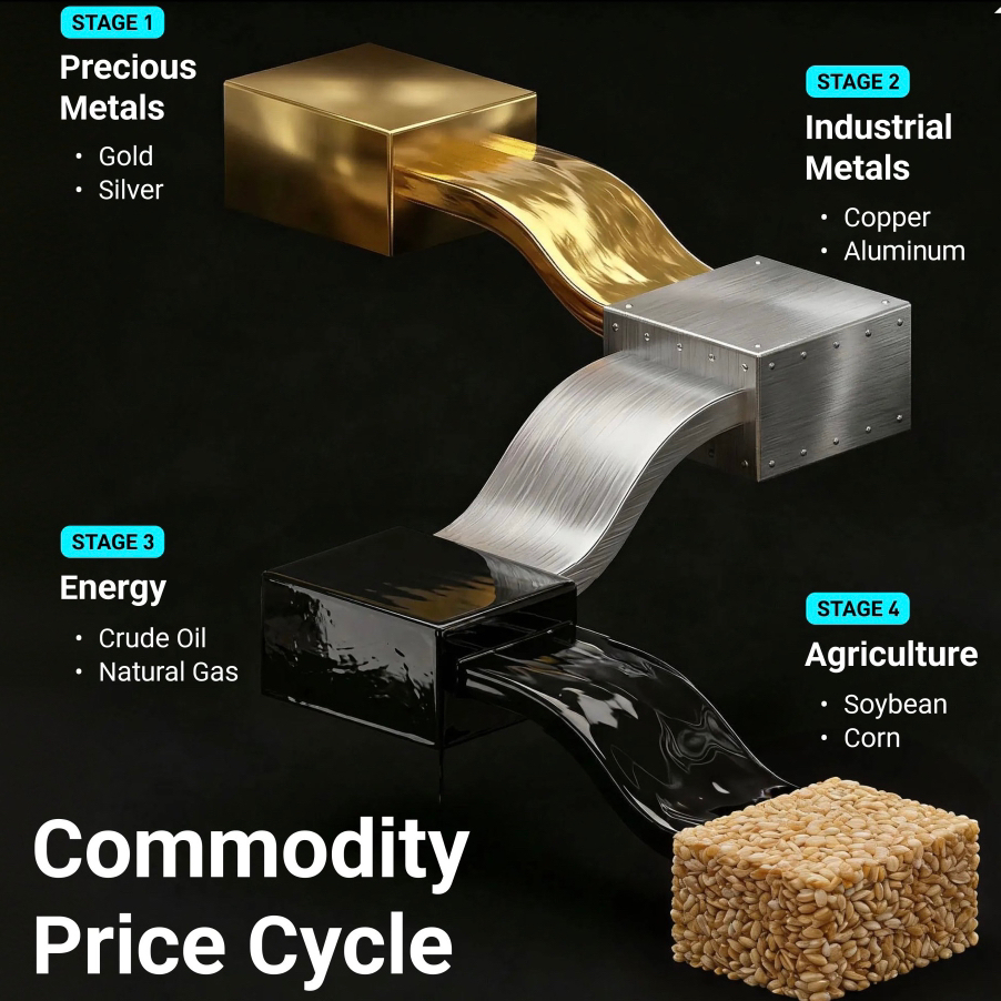 Thị trường không di chuyển ngẫu nhiên. Vốn luân chuyển, và nó diễn ra theo những mô hình lặp lại qua các chu kỳ. Trong TradFi, sự luân chuyển này được ghi chép rõ ràng: kim loại quý → kim loại công nghiệp → năng lượng → nông nghiệp. Đây là một cuộc tiếp sức lạm phát tài sản, và mỗi giai đoạn báo hiệu một giai đoạn khác nhau của thanh khoản và tăng trưởng.