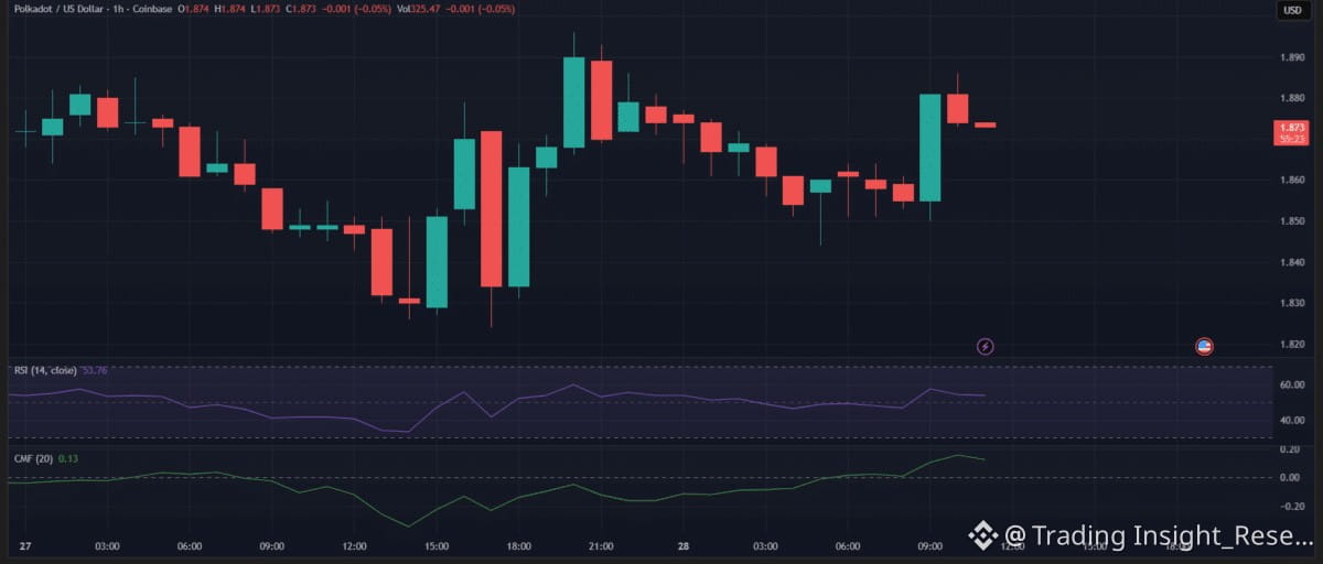 DOT mắc kẹt tại $1.87 (-0.05%), dao động khó chịu và không có xu hướng rõ ràng.
