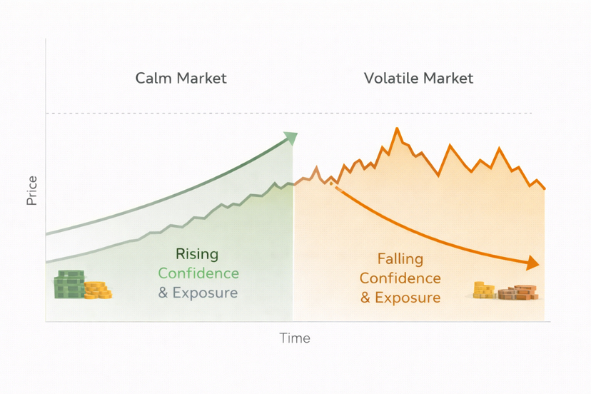 Con người tự nhiên tìm kiếm sự thoải mái. Thị trường trừng phạt sự thoải mái. Khi giá cả ổn định, mọi người từ từ tăng cường độ tiếp xúc. Khi giá cả biến động, mọi người giảm cường độ tiếp xúc một cách quyết liệt. Điều này dẫn đến việc mua cao hơn và bán thấp hơn theo thời gian. Tài sản thay đổi. Hành vi thì không.