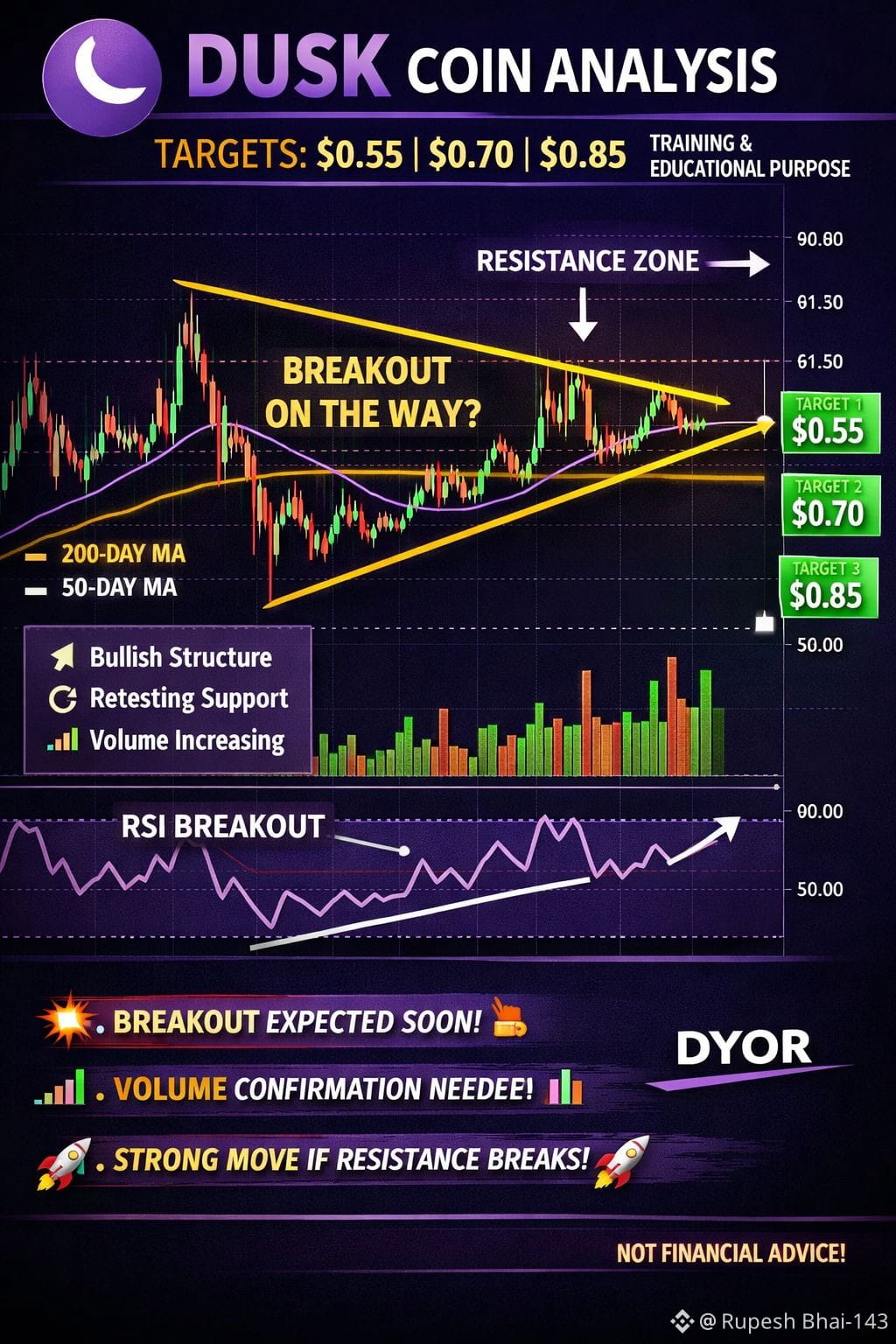 Network is currently forming an ascending triangle pattern on the chart indicating a potential breakout setup Price is making higher lows while facing strong resistance near the upper trendline The 50 day and 200 day moving averages are acting as key support levels, keeping the bullish structure intact Volume is gradually increasing which is a positive sign but strong volume confirmation is still required for a valid breakout RSI is also trending upward supporting bullish momentum If resistance breaks with volume targets to watch are $0.55 $0.70 and $0.85 @Dusk #dusk $DUSK