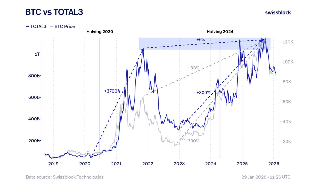- #BTC đã tăng +83% so với mức tối đa của chu kỳ trước, trong khi TOTAL3 chỉ tăng +6%.