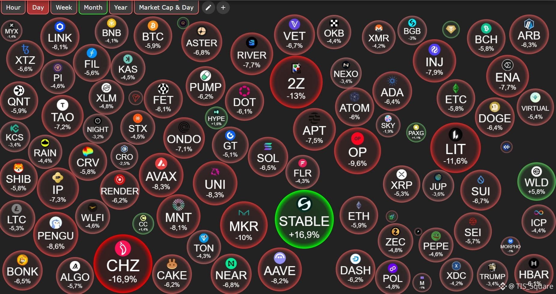Màu xanh lá cây lớn nhất trên bản đồ thuộc về Stablecoins với mức vốn hóa tăng trưởng, cho thấy nhà đầu tư đang tháo chạy khỏi tài sản rủi ro để nắm giữ tiền mặt.