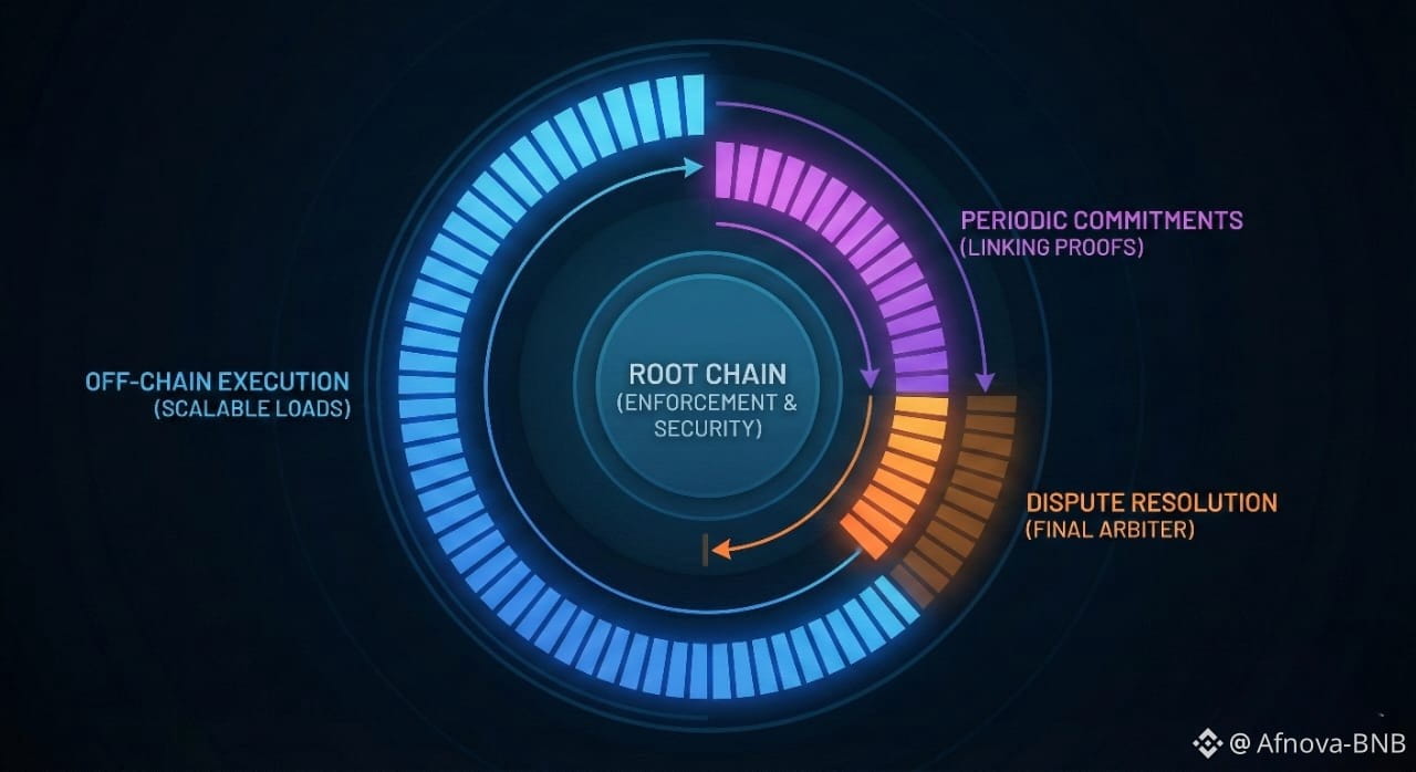 The fundamental idea behind Plasma is deceptively simple yet extremely powerful. Instead of forcing every participant in the network to process and verify every transaction, Plasma allows smart contract systems to operate autonomously outside the root chain. These systems continuously execute state changes, manage balances, and process economic activity while periodically committing cryptographic proofs back to the root blockchain. The root chain does not micromanage these operations. Instead, it acts as a final arbiter, stepping in only when something goes wrong. This separation of execution and enforcement is the key that allows Plasma to scale to levels that would otherwise be impossible.