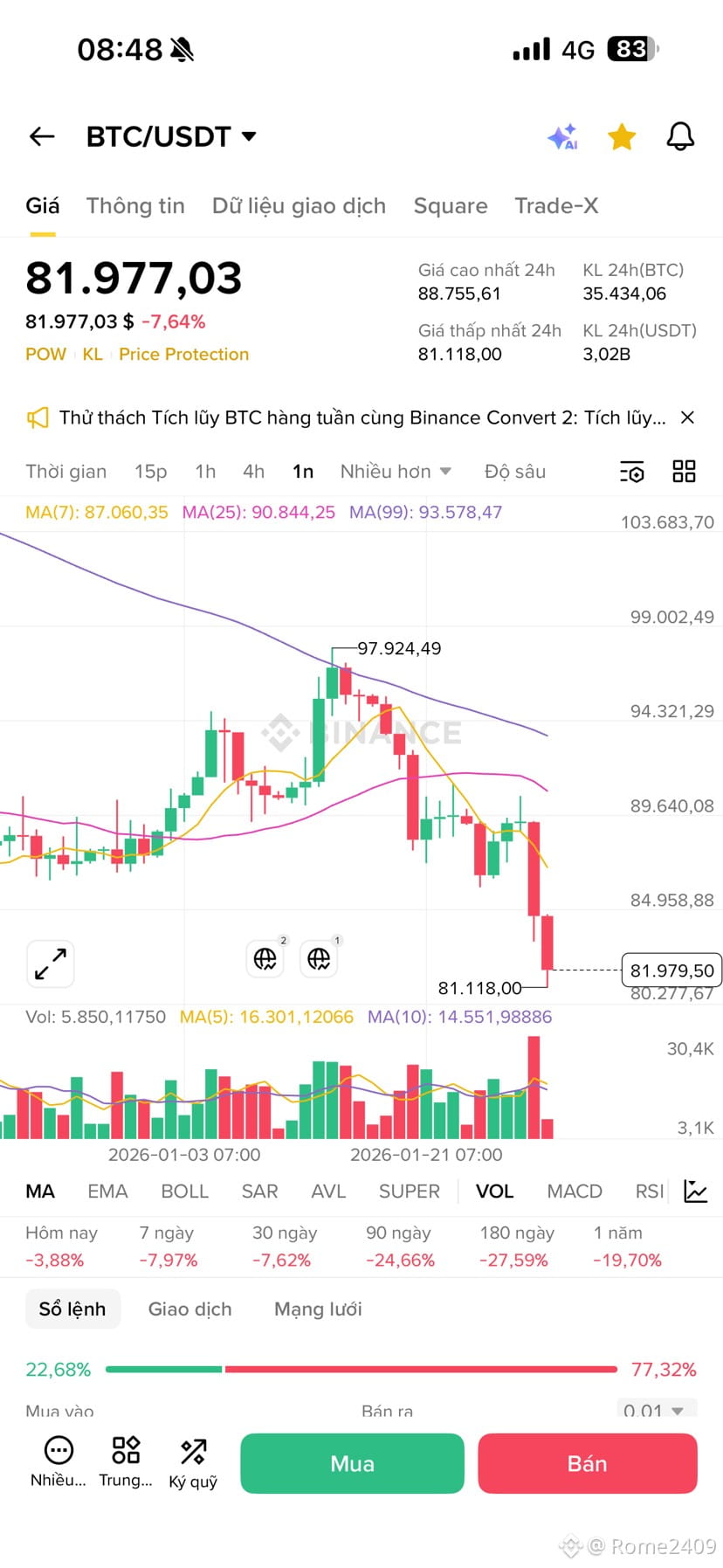 • BTC đang giao dịch quanh mốc 81.977 USD, vừa để mất hỗ trợ quan trọng tại đường MA7 và MA25.