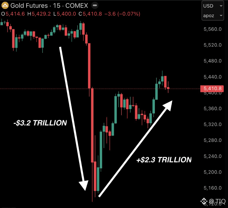 👉Giá vàng đã biến động mạnh, giảm 7% xuống còn 5,250 USD chỉ trong một giờ trước khi phục hồi ngoạn mục hình chữ V. Vốn hóa của thị trường vàng đã biến động tới 5.5 nghìn tỷ USD chỉ trong một phiên mức biến động trong ngày lớn nhất lịch sử. Đến đầu phiên châu Á sáng thứ Sáu, giá vàng giao ngay đã phục hồi lên trên 5,400 USD, tăng khoảng 1%