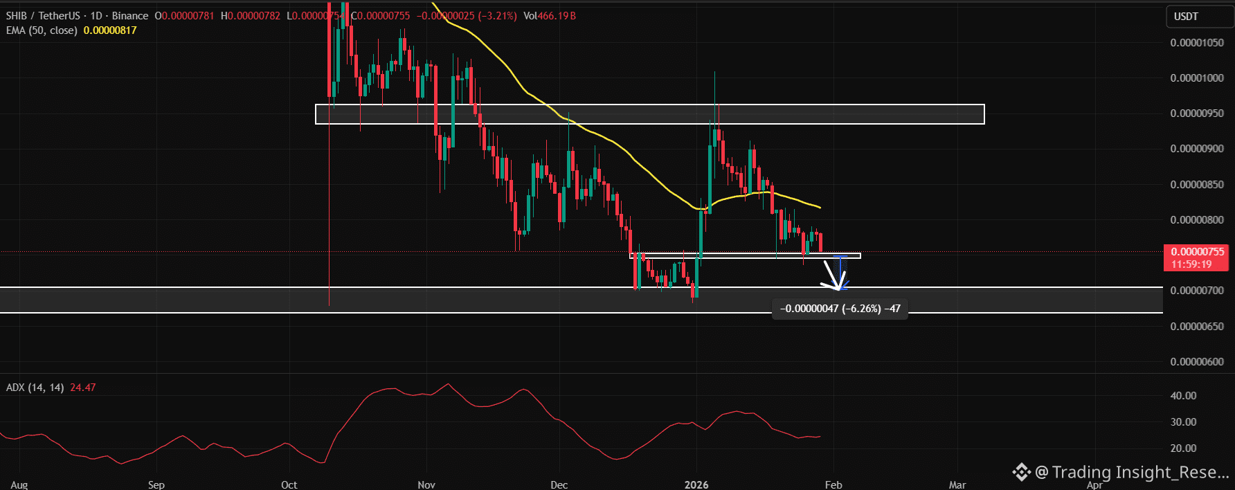 $SHIB đang đứng bên bờ vực sụp đổ. Memecoin này đang giao dịch ở mức $0.00000755, chật vật bám trụ tại vùng hỗ trợ quan trọng khi cá voi đẩy nhanh tốc độ thoát hàng.