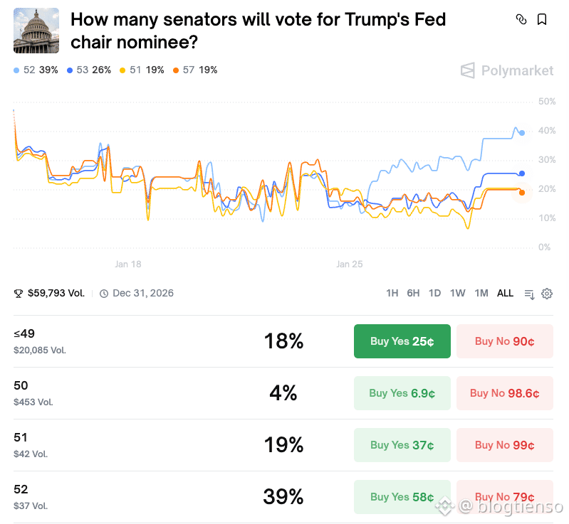 Mặc dù việc đề cử ông Warsh có vẻ khả thi, nhưng việc phê chuẩn lại không chắc chắn. Polymarket cho thấy 39% khả năng được thông qua với chính xác 52 phiếu bầu—kịch bản khả thi nhất—trong khi xác suất bị bác bỏ hoàn toàn là 18% phản ánh sự không chắc chắn về việc Thượng nghị sĩ Tillis đe dọa ngăn chặn.