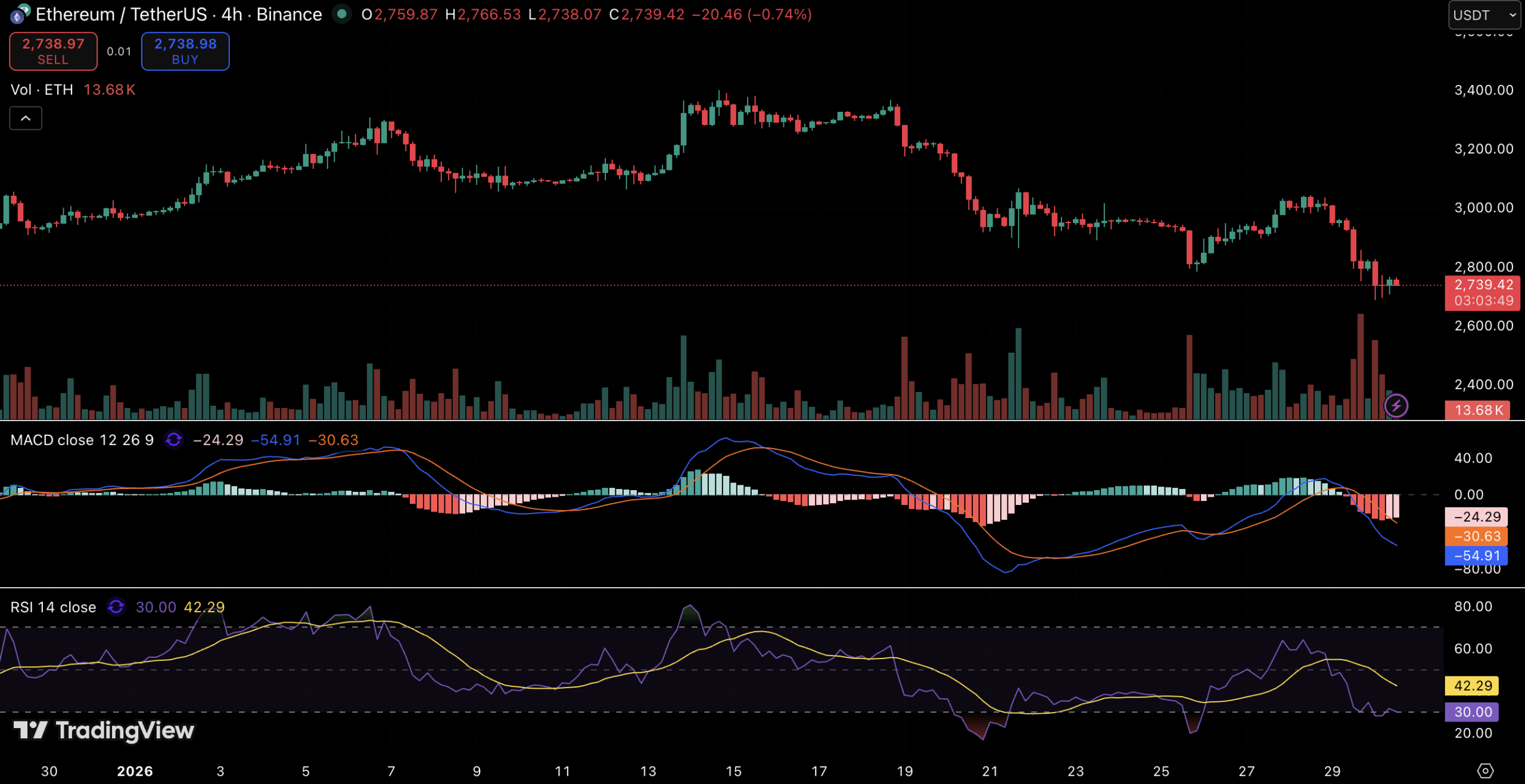 Bức tranh kỹ thuật của Ethereum đã trở nên yếu hơn rõ rệt sau đợt bán tháo thị trường rộng lớn, với ETH giảm gần 7% về khu vực 2,700 đô la khi Bitcoin giảm xuống khoảng 82,000 đô la.