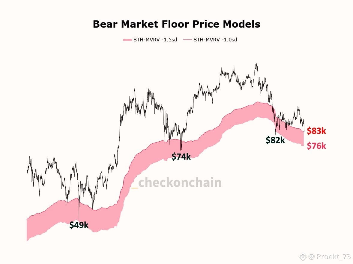 Модель нижней границы для #BTC от #Checkonchain сейчас показывает - у продавцов в этом цикле максимальная рабочая зона давления - примерно 76 000-83 000$. Как видно по графику, это коридор, где в прошлом конкретно в этом цикле на бычьем рынке падение чаще замедлялось и начиналась борьба спроса с паникой. Как они строят этот коридор с STH-MVRV? Розовая зона на графике - это расчетный "коридор капитуляции" краткосрочных держателей BTC: диапазон цен, где те, кто покупал недавно, обычно оказываются в типично сильном убытке.