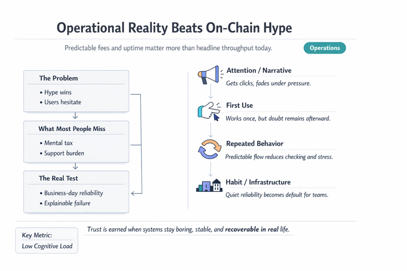 Sau nhiều thập kỷ theo dõi các thị trường lặp lại chính mình, tôi đã học được cách không tin tưởng vào những khoảnh khắc cảm thấy ồn ào, những băng rôn, các đối tác, các mốc thời gian, những giọng nói tự tin chỉ xuất hiện khi nến màu xanh. Thực tế vận hành không quan tâm đến sự phấn khích, nó quan tâm đến sự nhất quán tẻ nhạt, thời gian hoạt động, chi phí có thể dự đoán, các chế độ thất bại có thể dự đoán, và loại công việc hỗ trợ mà không ai chụp màn hình. Bài kiểm tra thực sự cho bất kỳ chuỗi nào không phải là nó có thể chạy trên chuỗi hay không, mà là nó có thể chạy trong một ngày làm việc, trong một hàng đợi hỗ trợ khách hàng, trong một đánh giá tuân thủ, trong một đội ngũ sản phẩm có thời hạn và không kiên nhẫn với những điều bí ẩn.