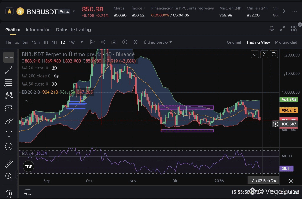 Cerramos una semana compleja para BNB, caracterizada por una corrección profunda que ha puesto a prueba los nervios de los operadores. Tras perder la zona de confort de los 900 USDT, el precio ha ido a buscar "gasolina" a niveles inferiores. ¿Es esto el fin de la tendencia o una oportunidad de re-acumulación?