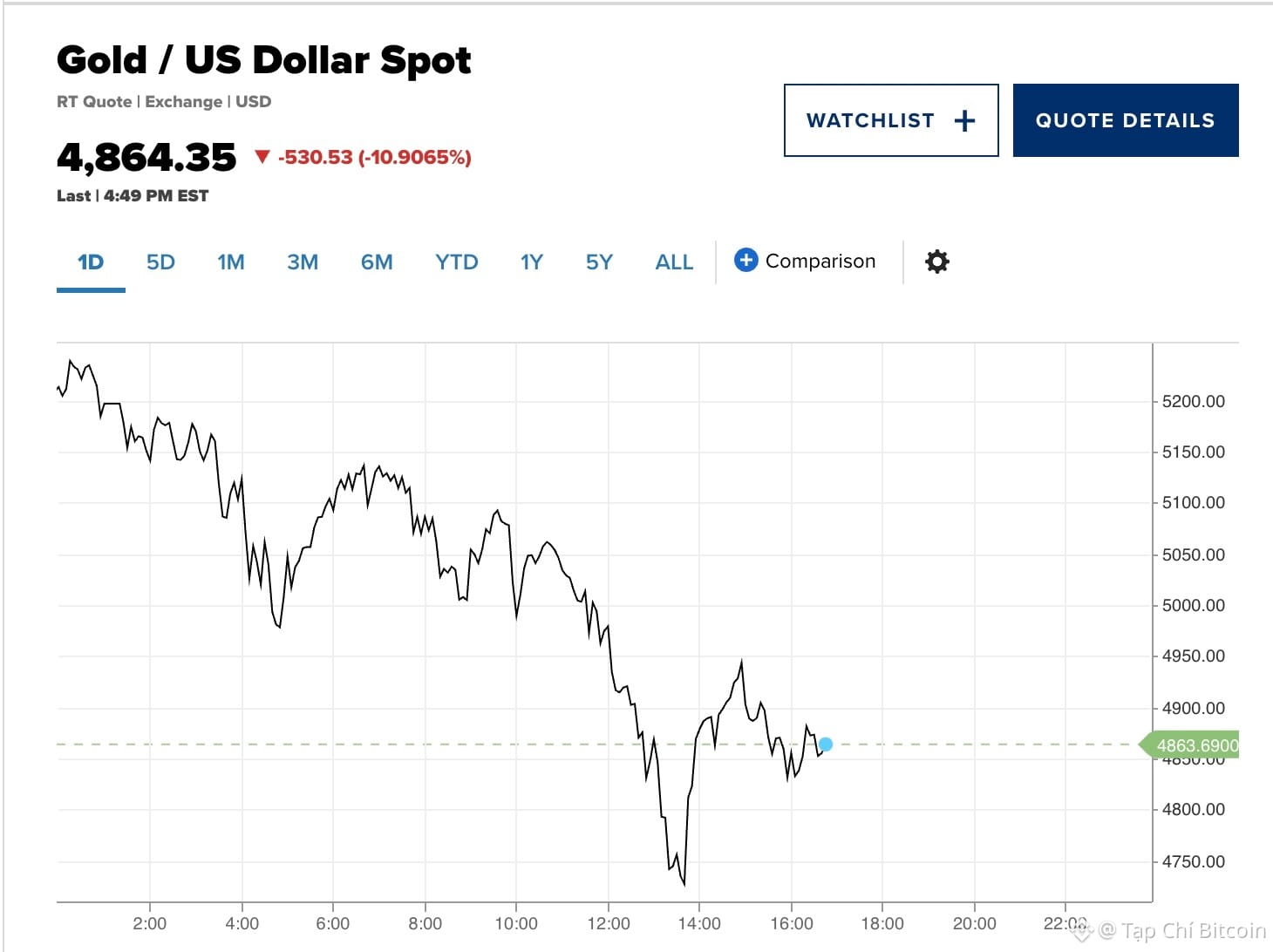 Trong khi đó, vàng giao ngay mất khoảng 9%, lùi về 4.895,22 USD/ounce. Hợp đồng vàng tương lai giảm 11,4%, đóng cửa tại 4.745,10 USD.