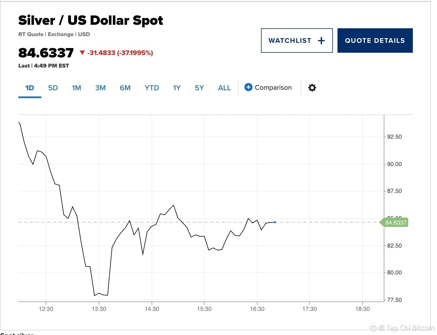 Bạc giao ngay giảm khoảng 28% xuống còn 83,45 USD/ounce, dao động gần mức thấp nhất trong ngày. Hợp đồng bạc tương lai lao dốc 31,4% và chốt phiên ở 78,53 USD, đánh dấu phiên giảm sâu nhất kể từ tháng 3/1980.