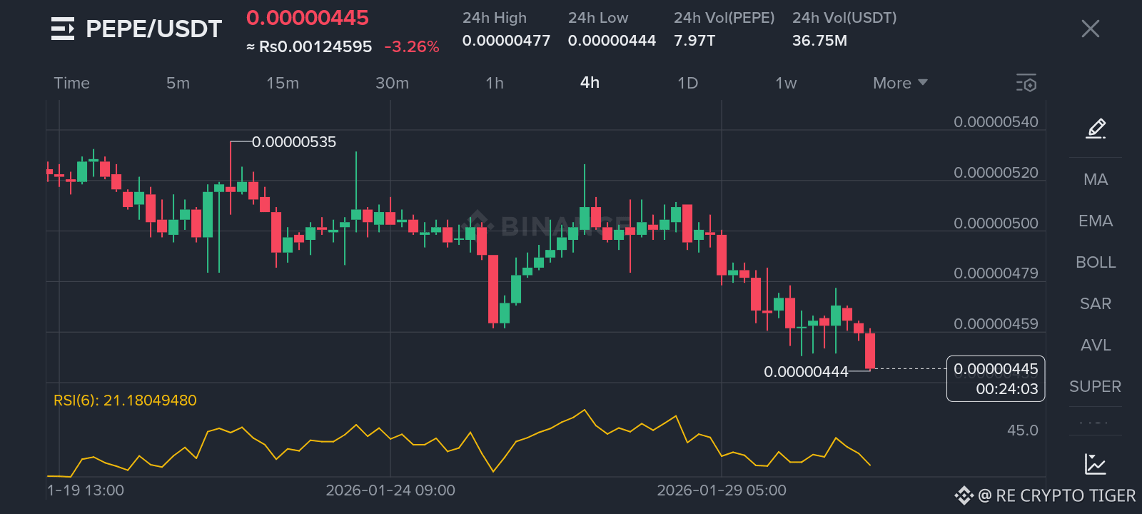 Tiger’s Insight: PEPE ne apne naye low $0.00000444 ko touch kiya hai. RSI yahan bhi 21 par hai, jo ke buyers ke liye "Discount Zone" ho sakta hai.