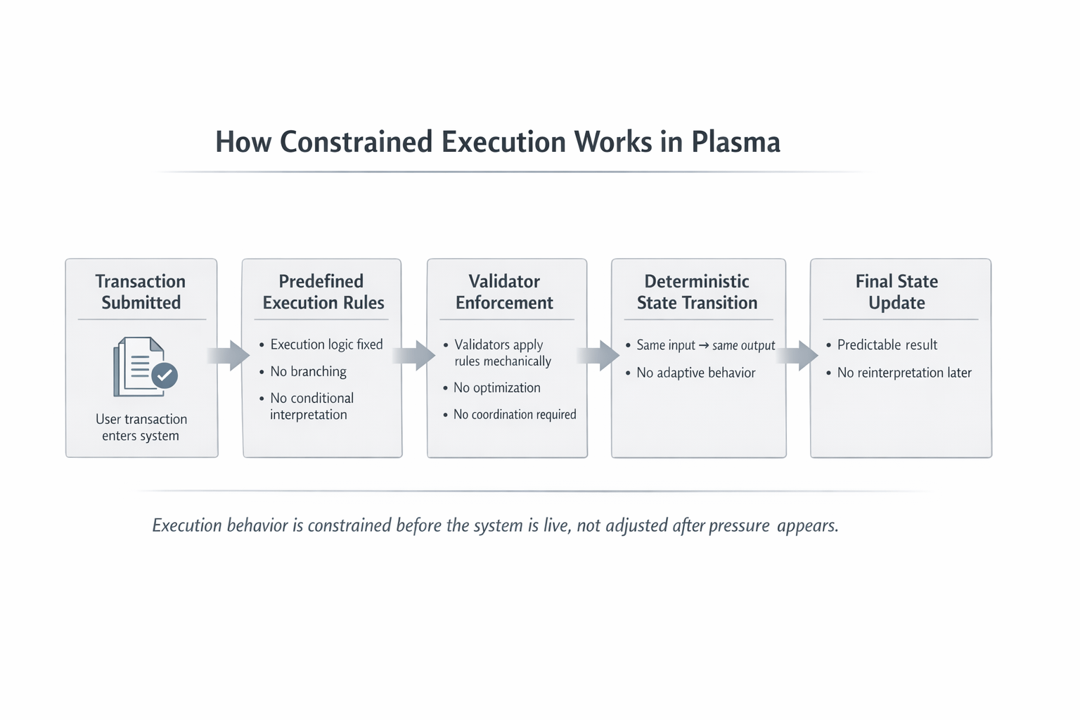 Nghe có vẻ trừu tượng, nhưng thực tế đó là một sự lựa chọn thiết kế rất cụ thể. Thay vì cho hệ thống nhiều cách để diễn giải các chuyển trạng thái, Plasma thu hẹp các con đường thực thi càng nhiều càng tốt. Ít tùy chọn hơn, ít nhánh hơn, ít trường hợp ngoại lệ hơn. Khi các quy tắc thực thi được thiết lập, chúng được dự định hành xử theo cùng một cách mỗi lần.