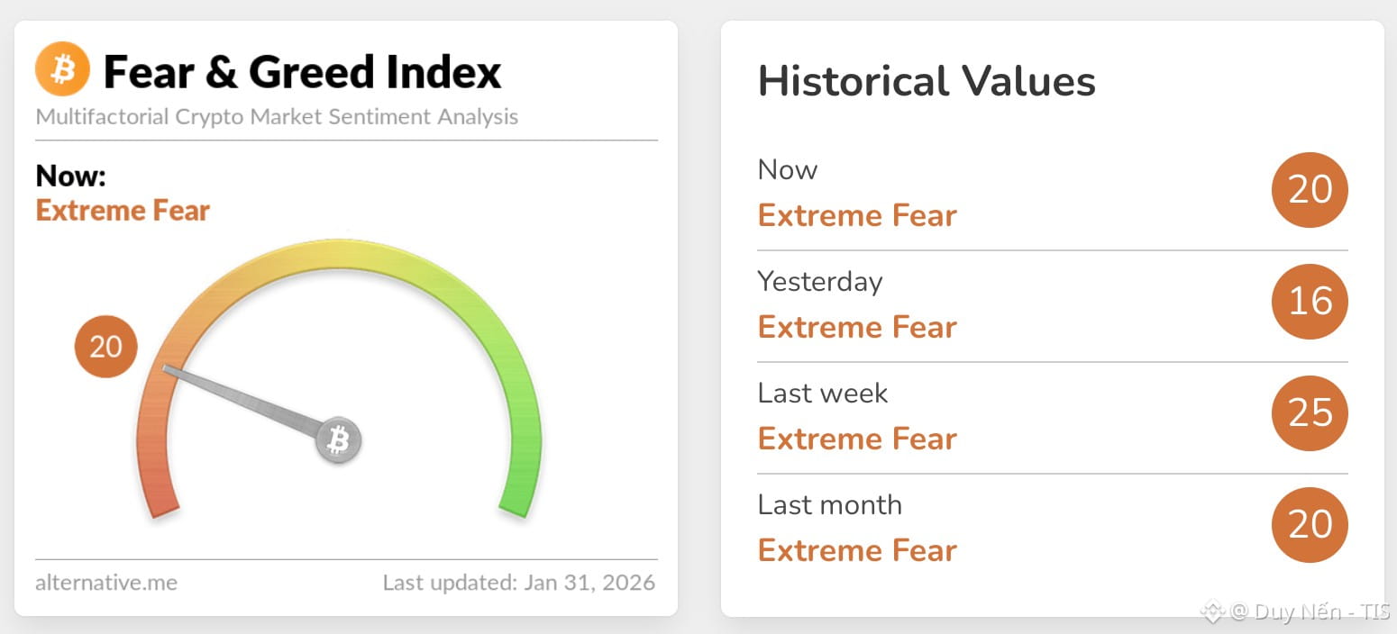 Thực tế là anh em đang sợ thật. Chỉ số Fear & Greed vừa tụt xuống mức 20, thậm chí hôm thứ Sáu còn chạm đáy 16 mức thấp nhất kể từ đầu năm 2026 đến nay.