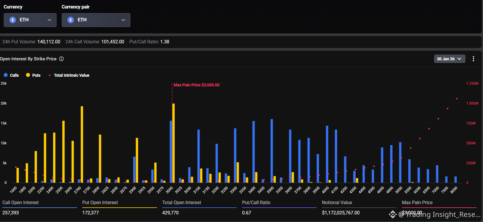 ETH cũng tương tự với tỷ lệ Put/Call 24h đạt 1.38 và Max Pain tại $3,100.