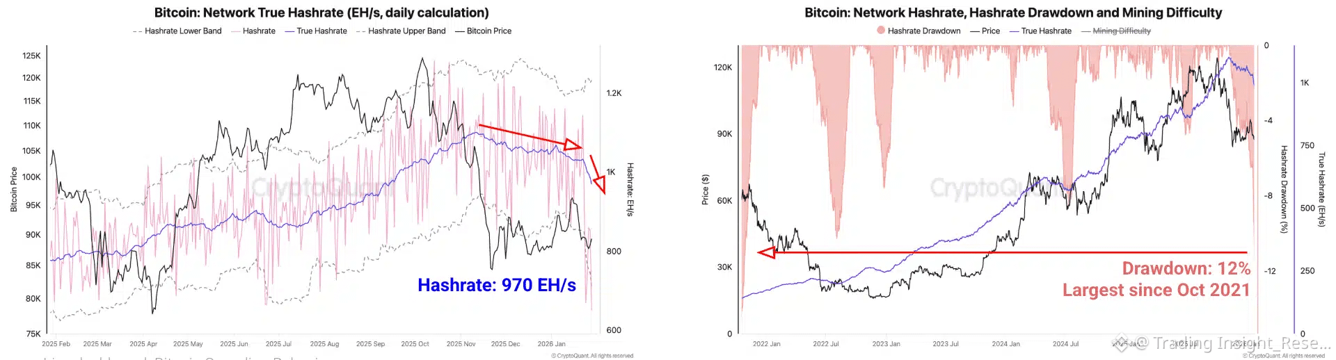 Hashrate của Bitcoin đã lao dốc ~12% về 970 EH/s, mức giảm sâu nhất kể từ tháng 10/2021.