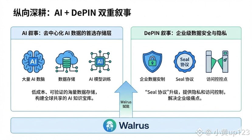 🟡 AI + DePIN 的双重叙事除了横向扩张,它还在纵向深耕。Walrus 正在与 AI 领域建立深度合作,目标是成为去中心化 AI 数据的首选存储层。AI 训练需要海量数据,而 Walrus 的低成本和可验证性完美契合了这一需求。再加上"Seal 协议"升级带来的隐私和访问控制功能,它解决了企业级 AI 应用最头疼的数据安全问题。这让它同时踩中了 DePIN 和 AI 两个黄金赛道。想象一下,未来所有的 AI 模型训练数据都可以安全、透明地存储在 Walrus 上,形成一个全球共享的知识宝库。