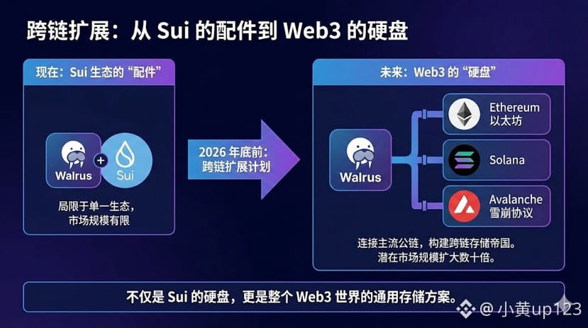 🔴 不止于 Sui,目标是星辰大海 Walrus 的 2026 年路线图里,最让我兴奋的是"跨链扩展"计划。它计划在今年年底前,将存储网络扩展到以太坊、Solana 和 Avalanche。这意味着,未来无论你在哪个生态开发应用,都能使用 Walrus 便宜又安全的存储服务。它想做的不是"Sui 的硬盘",而是"Web3 的硬盘"。这种开放的格局,让它的潜在市场规模扩大了数十倍。想想看,现在每个公链都有自己的存储方案,标准不统一,开发成本高。Walrus 的跨链存储将成为标准化解决方案。