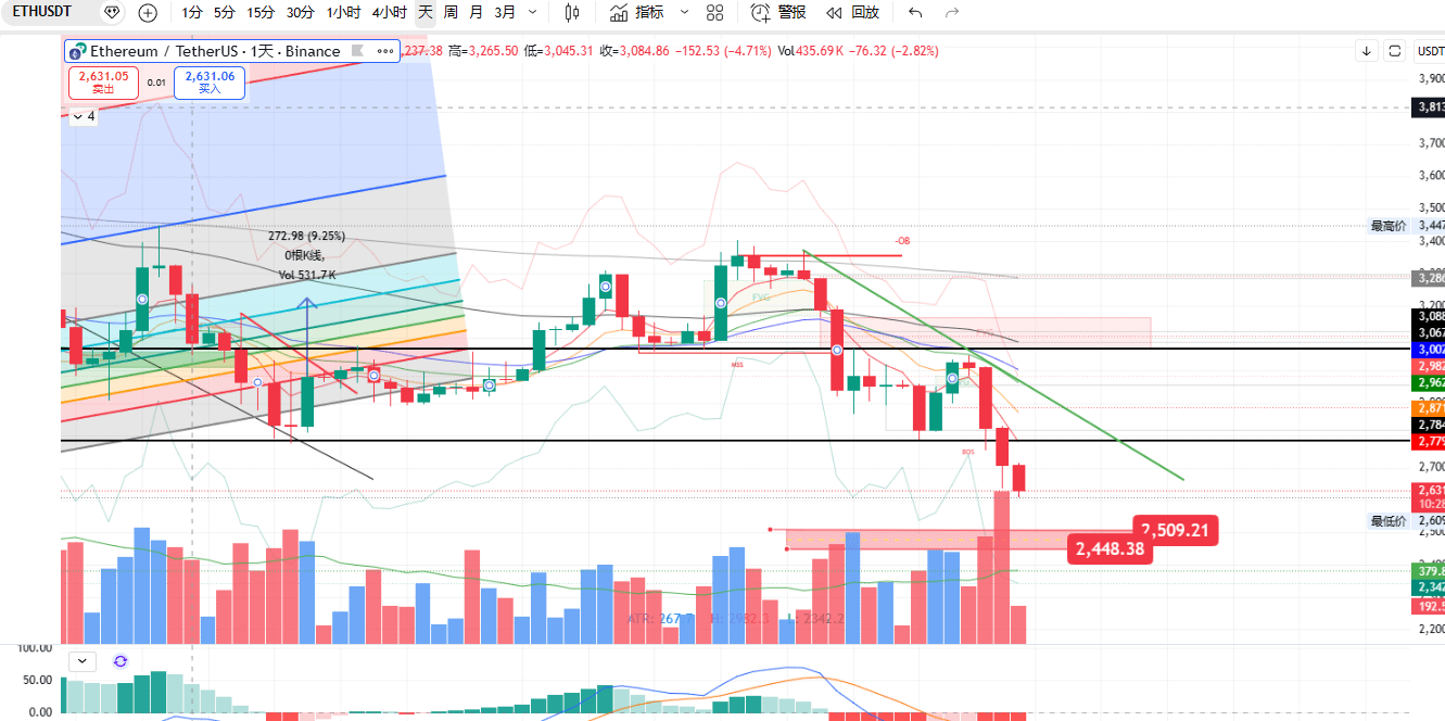 ETH: Xu hướng di chuyển đồng bộ với BTC, giá có khả năng tiếp tục giảm, vùng hỗ trợ tiếp theo là 2,445-2,500 USD, mục tiêu phục hồi là 2,750-2,850 USD.