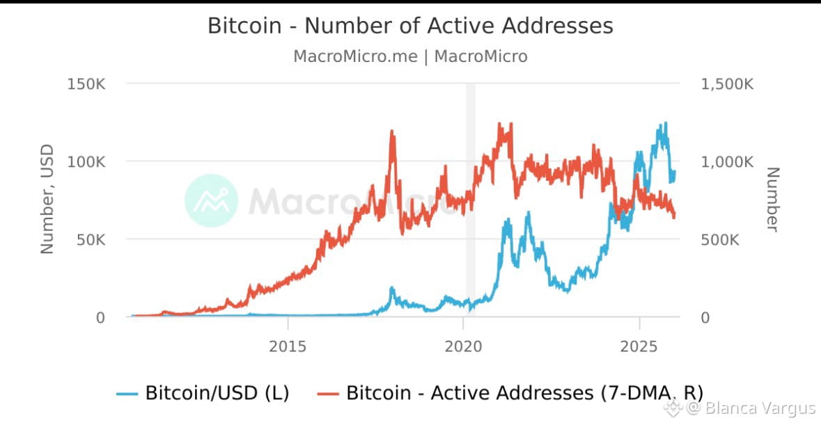BTC is trading at elevated levels, yet active addresses are declining — signaling weakening network participation.
