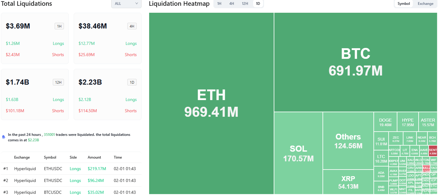 Các vị thế Long đã bị thanh lý với giá $1.958 tỷ; Vị thế Short đã bị thanh lý với giá $103 triệu.