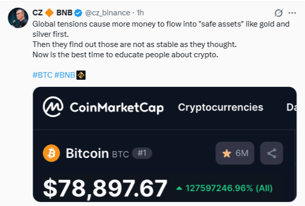Nhiều yếu tố chính trị và kinh tế đã thúc đẩy vốn tìm kiếm nơi trú ẩn an toàn như vàng và bạc. Nhưng ngay cả những nơi trú ẩn an toàn đó cũng không còn an toàn nữa. Tiền điện tử sẽ nổi lên sau làn sóng "tài sản nơi trú ẩn an toàn", và đây là thời điểm vàng để giáo dục về tiền điện tử, như CZ đã nhấn mạnh.