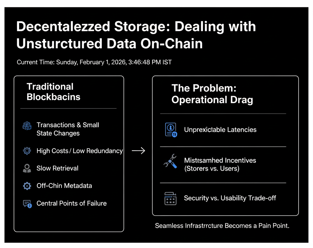 The bigger question is how we deal with big, unstructured data in blockchain settings. Most chains are made to handle transactions and small changes to the state, not big files like videos, datasets, or even tokenized assets that need to stay around for a long time. You end up with high costs for redundancy, slow retrieval because everything is copied everywhere, or worse, central points of failure that come back through off-chain metadata. Users feel like the interfaces are clunky because storing something means paying ongoing fees without clear guarantees. Developers run into problems when they try to scale apps that rely on verifiable data access. It is not that there are not enough storage options; it is the operational drag unpredictable latencies, mismatched incentives between storers and users, and the constant trade-off between security and usability that makes what should be seamless infrastructure a pain.