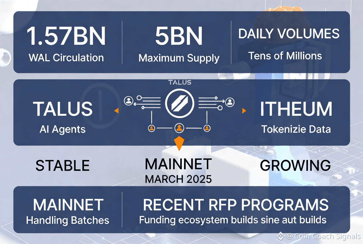 For context, the network has seen about 1.57 billion WAL in circulation out of a maximum supply of 5 billion. Recently, daily volumes have been in the tens of millions. This makes it possible to use integrations like Talus for AI agents or Itheum for tokenizing data. Usage metrics show steady growth, with the mainnet handling batches well since it launched in March 2025. Recent RFP programs have also helped fund ecosystem builds.