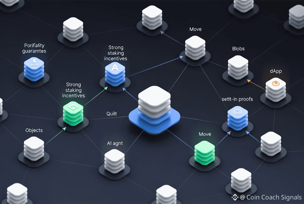 This means it can grow to hundreds of nodes without raising costs. Programmability is what it focuses on: blobs turn into objects on Sui, so you can use Move contracts to add logic like automatic renewals or access controls. It does not fully replicate on purpose; instead, it uses probabilistic guarantees where nodes prove availability every so often. This keeps overhead low but requires strong staking incentives to stop people from being lazy. This is important for real use because it changes storage from a passive vault to an active resource. For example, an AI agent could pull verifiable data without any middlemen, or a dApp could settle trades with built-in proofs. You won’t find flashy promises like “instant everything.” Instead, the design focuses on staying reliable over time, even under heavy use, such as when Quilt is used to batch many small files and cut gas costs by 100 times or more.